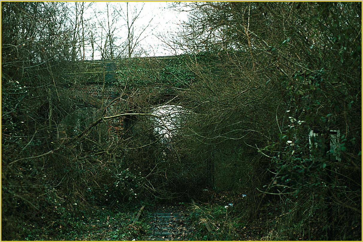 The west side of the bridge at Cherry Tree Lane (formerly Wood End Lane) in 1982, soon overgrown after the last train passed through.