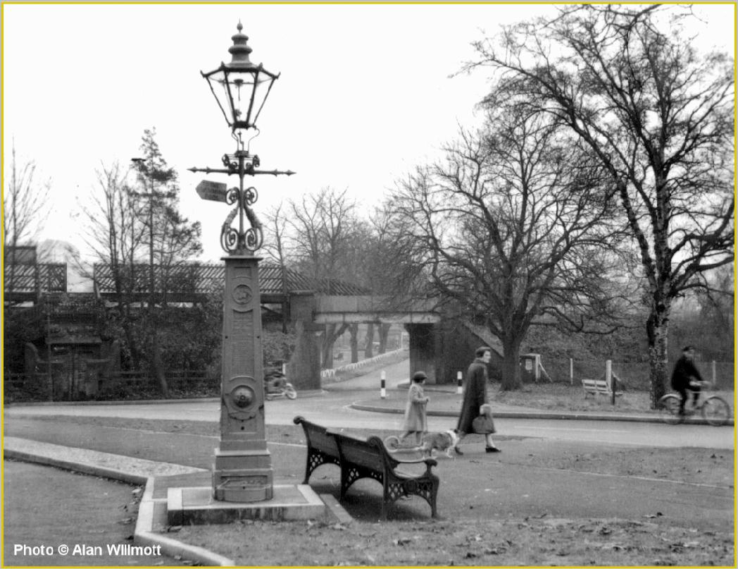 This 1959 photo shows the gate onto Heath Park Halt open with the steps leading down left to ground level and a public toilet below the Halt. The bridge to the right is Corner Hall Bridge.