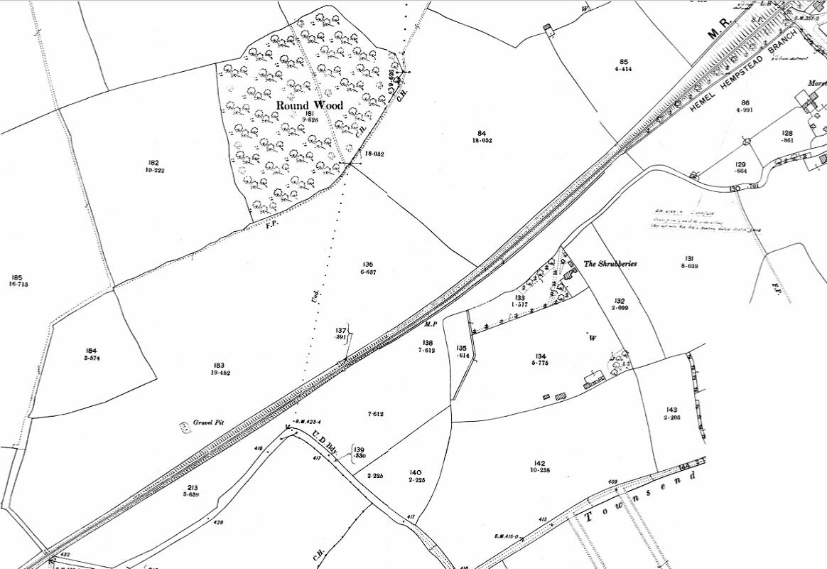The blue spot marks where Roundwood Halt was eventually located when it opened in 1927.