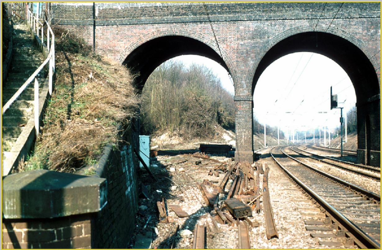 The severed Nickey Line access from the Midland Mainline under Hollybush Lane Bridge. The base of Harpenden Junction Signal Box can be seen through the left arch.