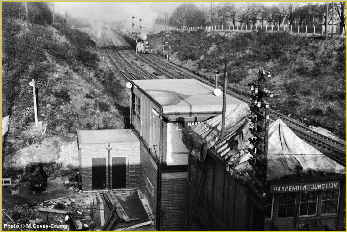 The New and Old Harpenden Junction Signalboxes in November 1957 photographed from Hollybush Lane Bridge. A goods train waits at the home signal on the Up Slow Main Line.