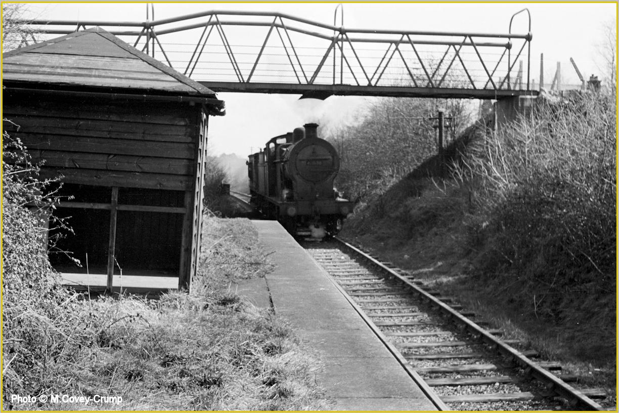 Class 3F Locomotive arriving at Roundwood Halt at the top of the 1:37 incline from the A6 Road Bridge in Harpenden. April 1955.